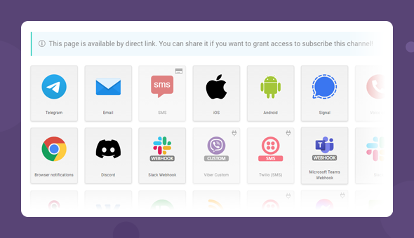 Reciba sus correos electrónicos de la manera que más le convenga: Telegram, Slack, Discord, SMS, llamadas de voz y mucho más están disponibles. Distribuya las notificaciones entre múltiples herramientas de comunicación, agregue suscriptores y envíe a chats grupales si es necesario